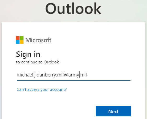 Problem 1: The very first time you go to either Webmail or Teams links above you'll be greeted with a screen like this, you will have to manually type in your full email address. It is identical to your former Enterprise Email address, except @mail.mil is replaced with @army.mil (Army Users ONLY)