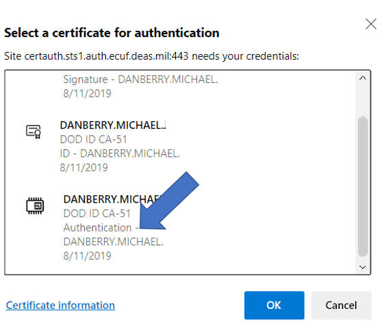 The Authentication certificate is comprised of your 10 digit DoD ID