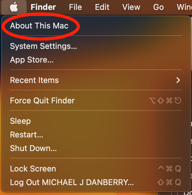 Step 3b: Look next to macOS for: Example: Ventura 13.0.1 (image is from an Intel based Mac, screen will look similar with an M processor)