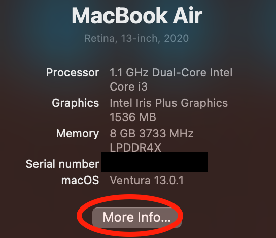 Step 2b: Click "More Info..." (button), (image is from an Intel based Mac, screen will look similar with an M processor)