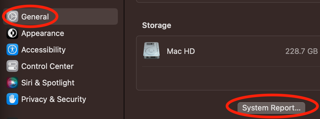 Click the "System Report..." button (image is from an Intel based Mac, screen will look similar with an M processor)