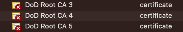 You need to manually trust the DoD Root CA 3, 4, 5, & 6 certificates Double click each of the DoD Root CA certificates, select the triangle next to Trust, in the When using this certificate: select Always Trust, repeat until all 3 do not have the red circle with a white X.